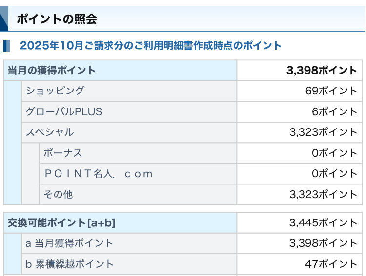8月16日~9月15日のショッピングに対する0.5%の通常ポイントが69ポイント、各回請求額の金額レンジで付与されるグローバルPLUSのポイントが9ポイントあるので、スペシャルポイントは3,323ポイントでした。