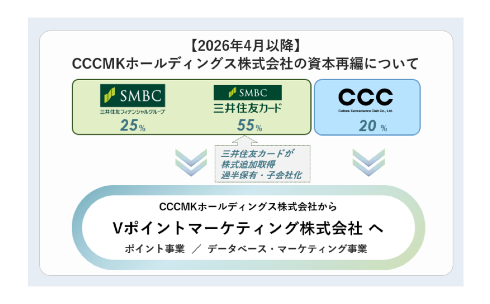 要点:2025年3月末を目途に三井住友カードが CCCMKホールディングスの株式を追加取得し、三井住友カードの子会社とする。最終的にCCCMKホールディングスの資本構成を「三井住友カード55%:三井住友フィナンシャルグループ 25%:CCC20%」とする。