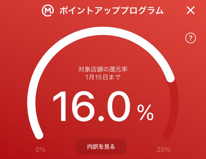 三菱UFJカードのいつものお店利用分に対する還元率は、ポイントプログラムの達成状況に応じて6%~最大20%に達します。筆者の場合はこの数ヶ月16.0%をキープしています。