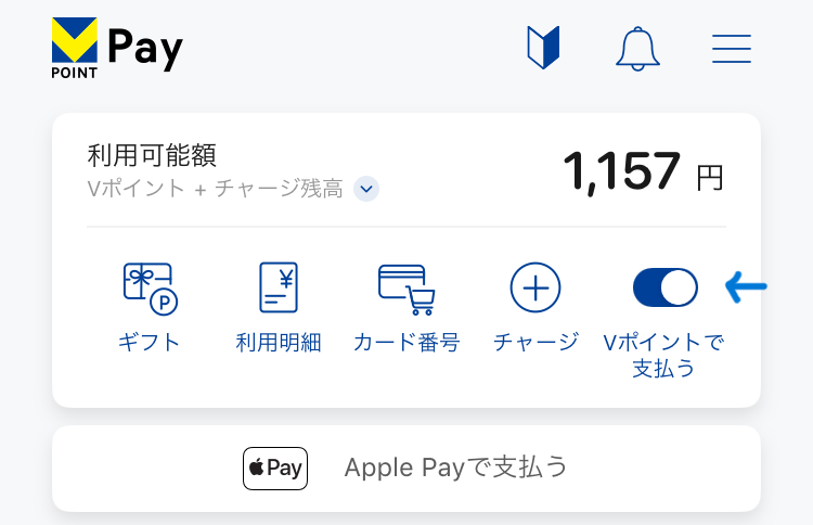使い方はいたって簡単、決済前にVポイントPayアプリで”Vポイントで支払う”のスライドスイッチをONにするのみです。