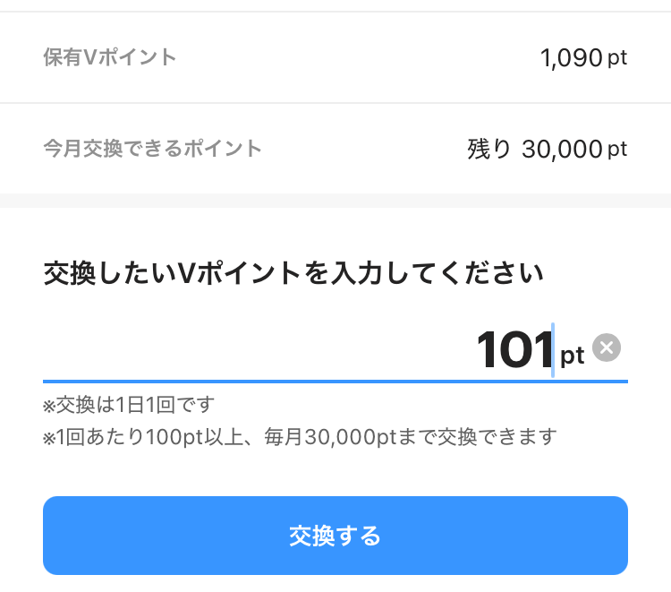交換ポイントは100ポイントから、1日1回ずつ、月30,000ポイントが限度です。